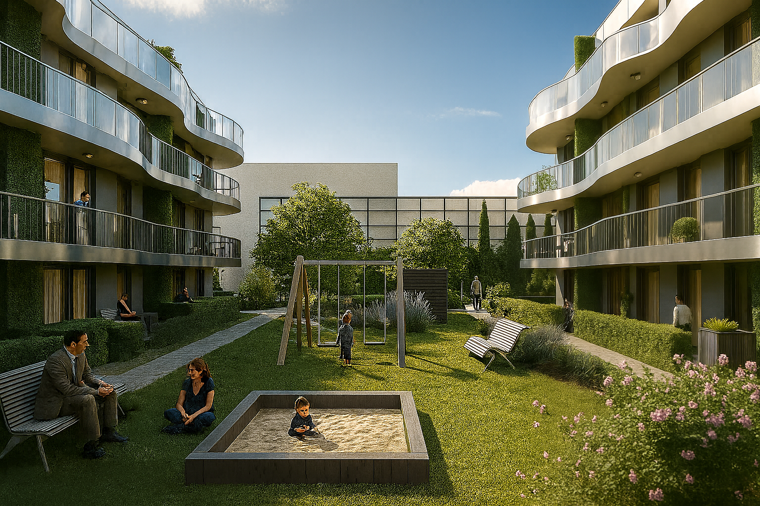 • Grün & Gemeinschaft: Begrünte Außenflächen und eigener Kinderspielplatz.